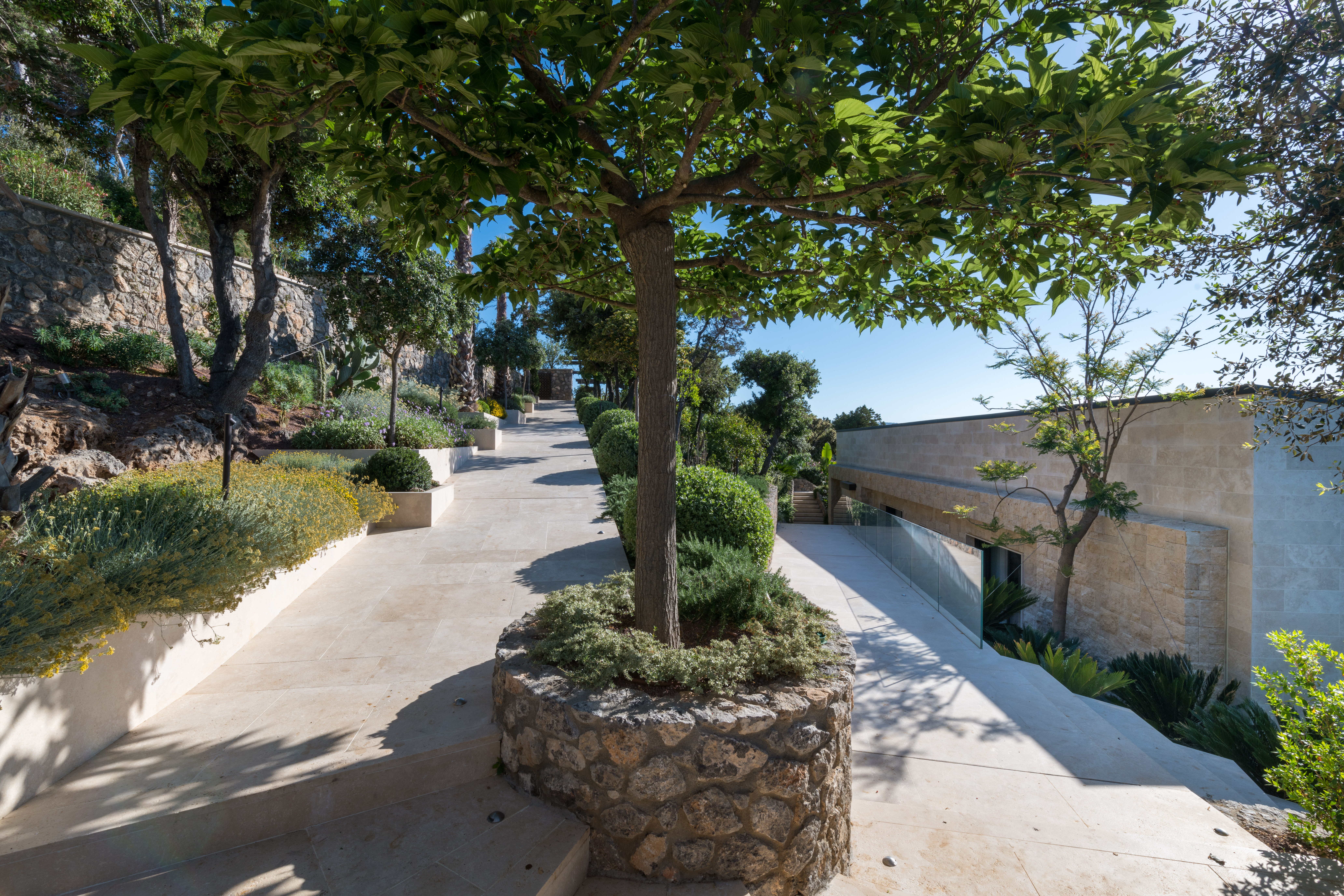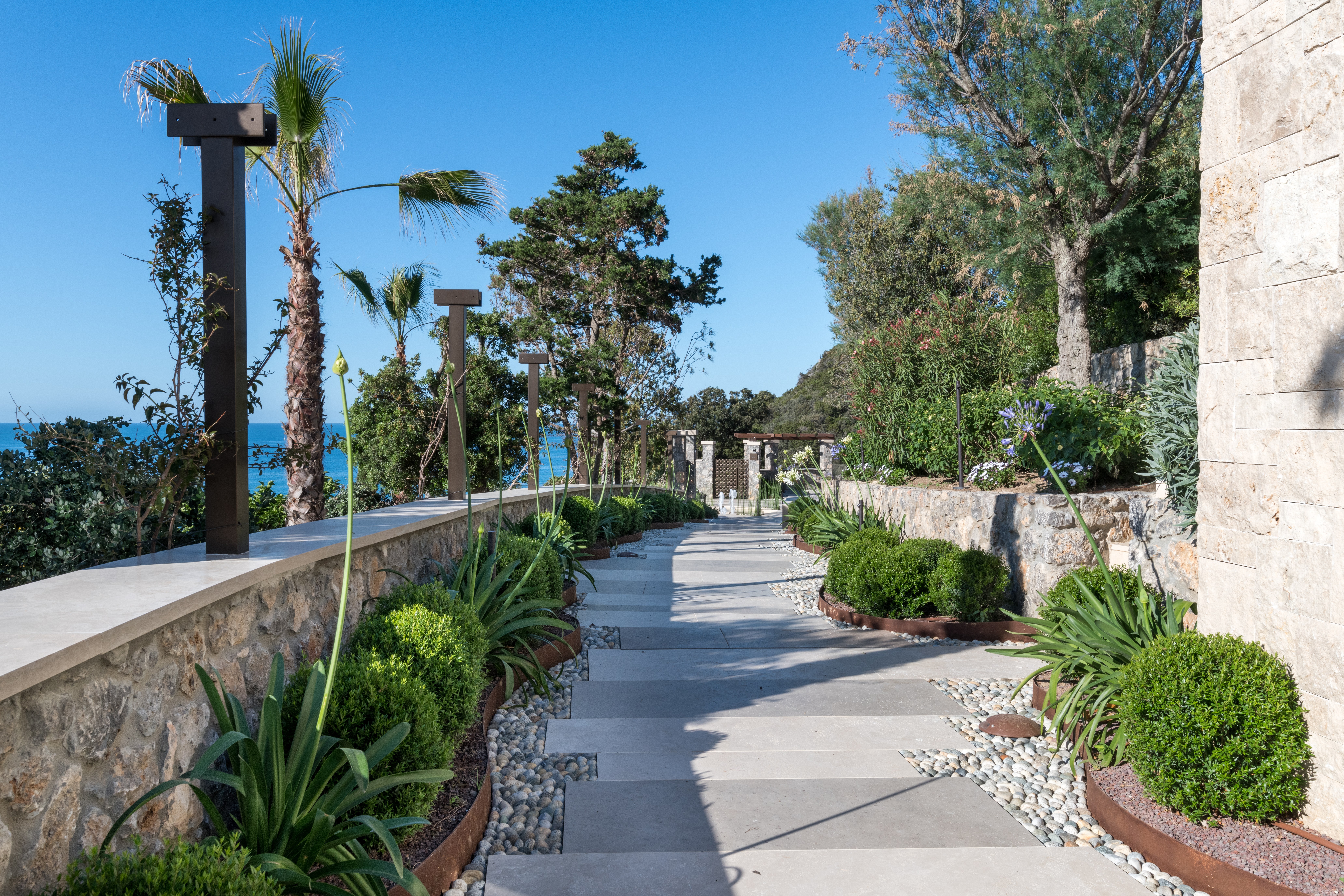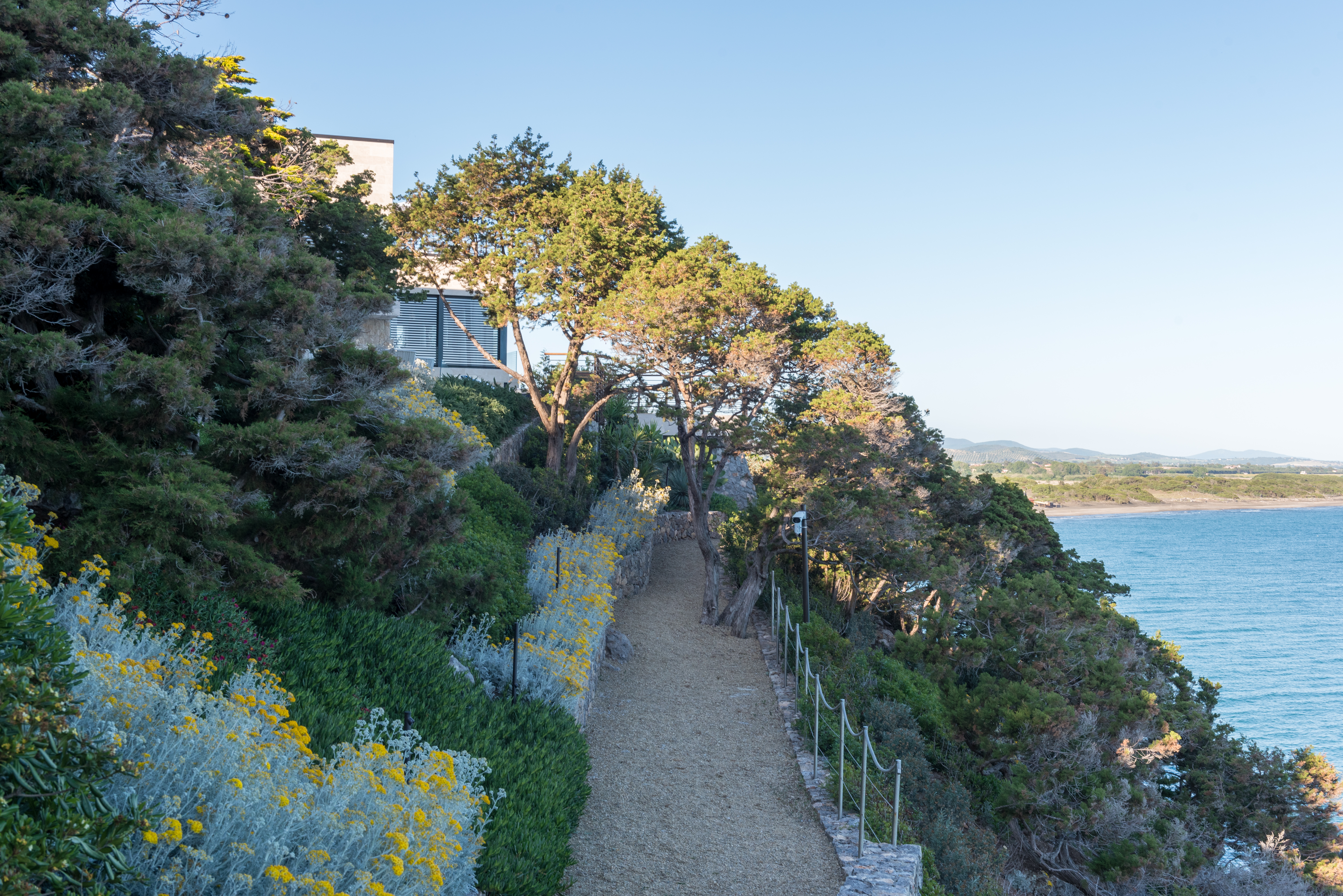 La costa tirrenica della Toscana è caratterizzata, nella zona dell’Argentario, da alte scogliere. La proprietà si presenta con una villa e altri quattro edifici aggrappati come albatri su di uno scoglio a picco sul mare. Questo scoglio è diventato un giardino, un giardino completamente inserito nell’ambiente circostante, un giardino su cui sono state incastonate preziose architetture e dentro al quale si aprono sorprendenti stanze verdi con finestre che si affacciano su splendidi panorami.