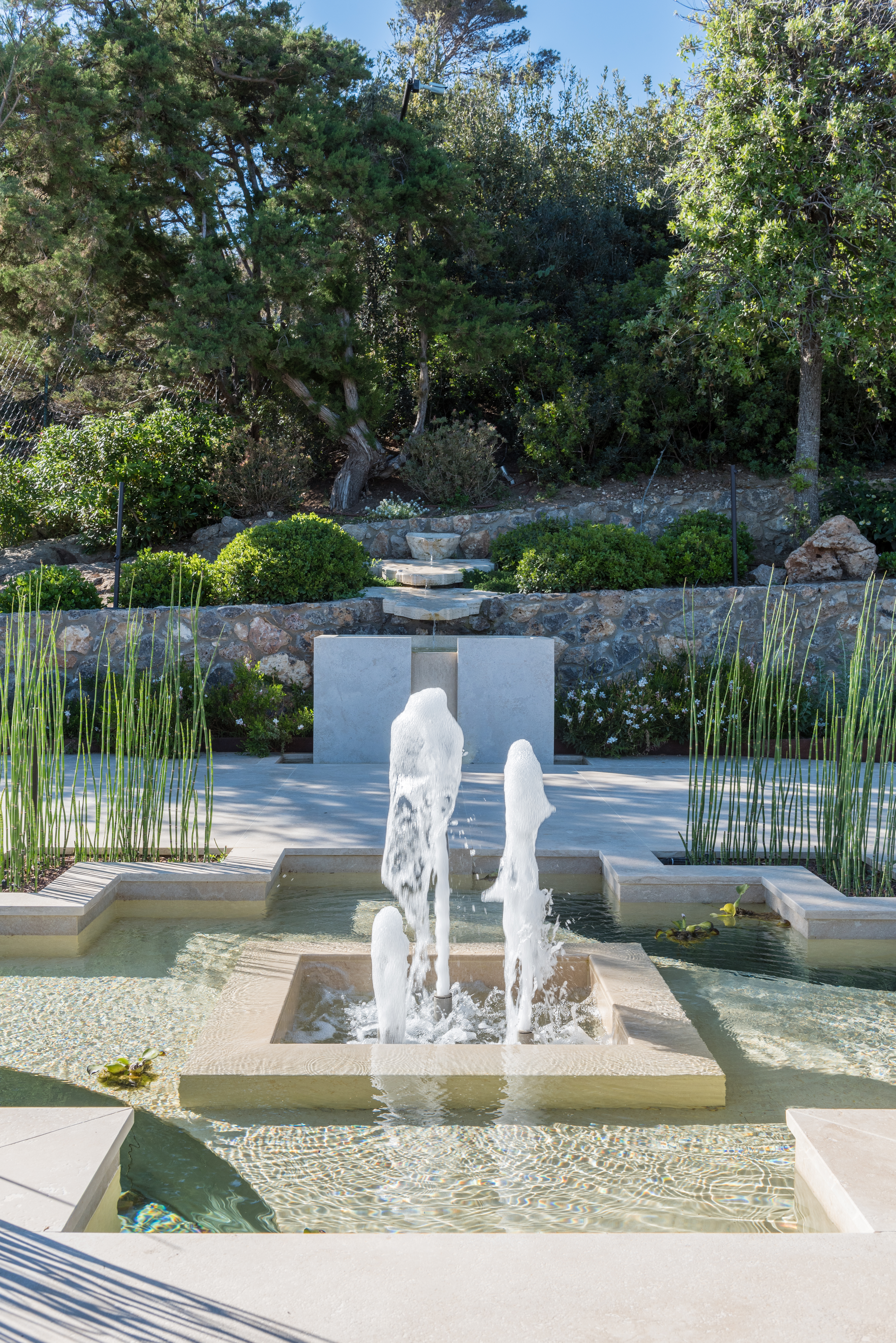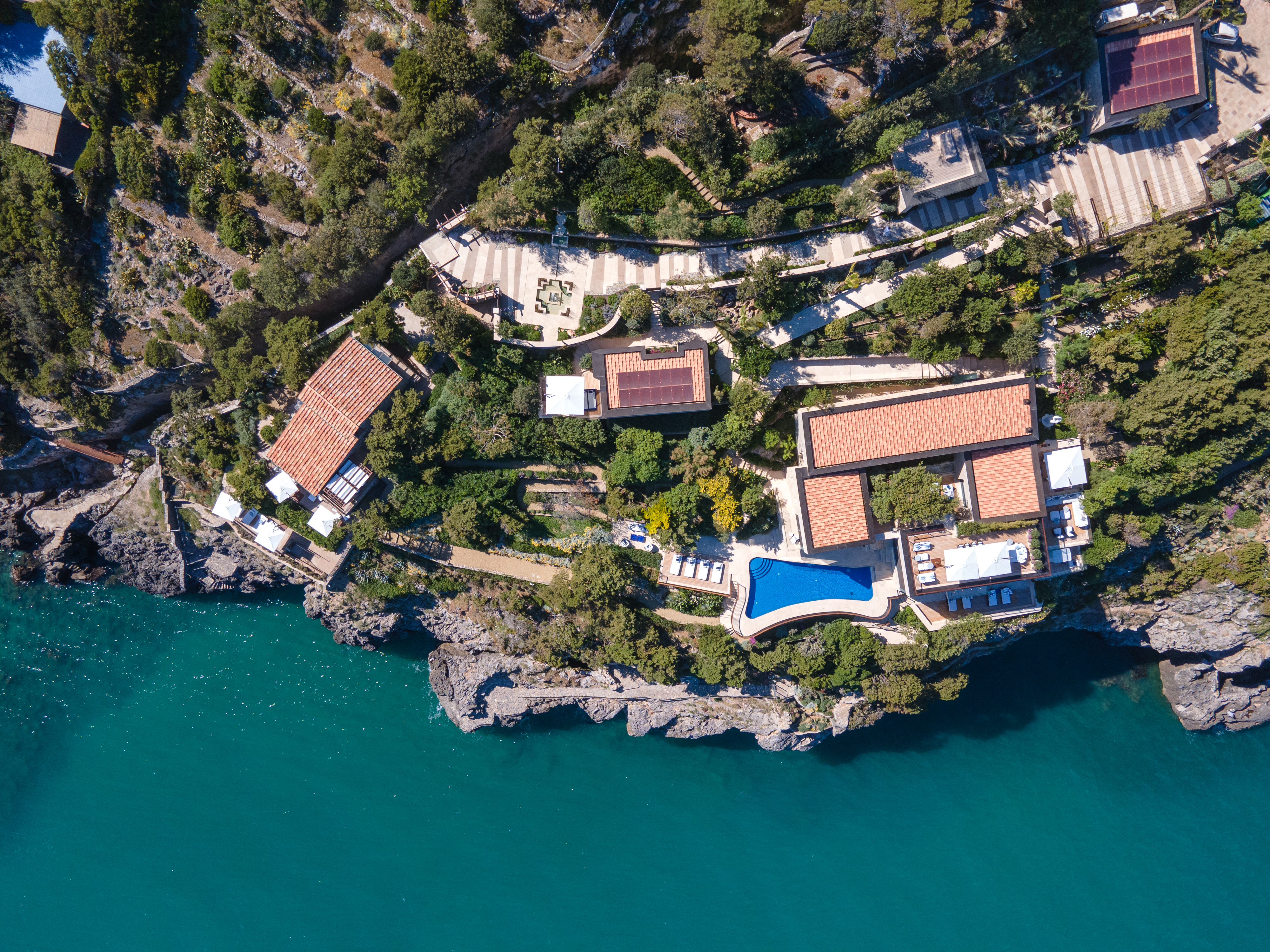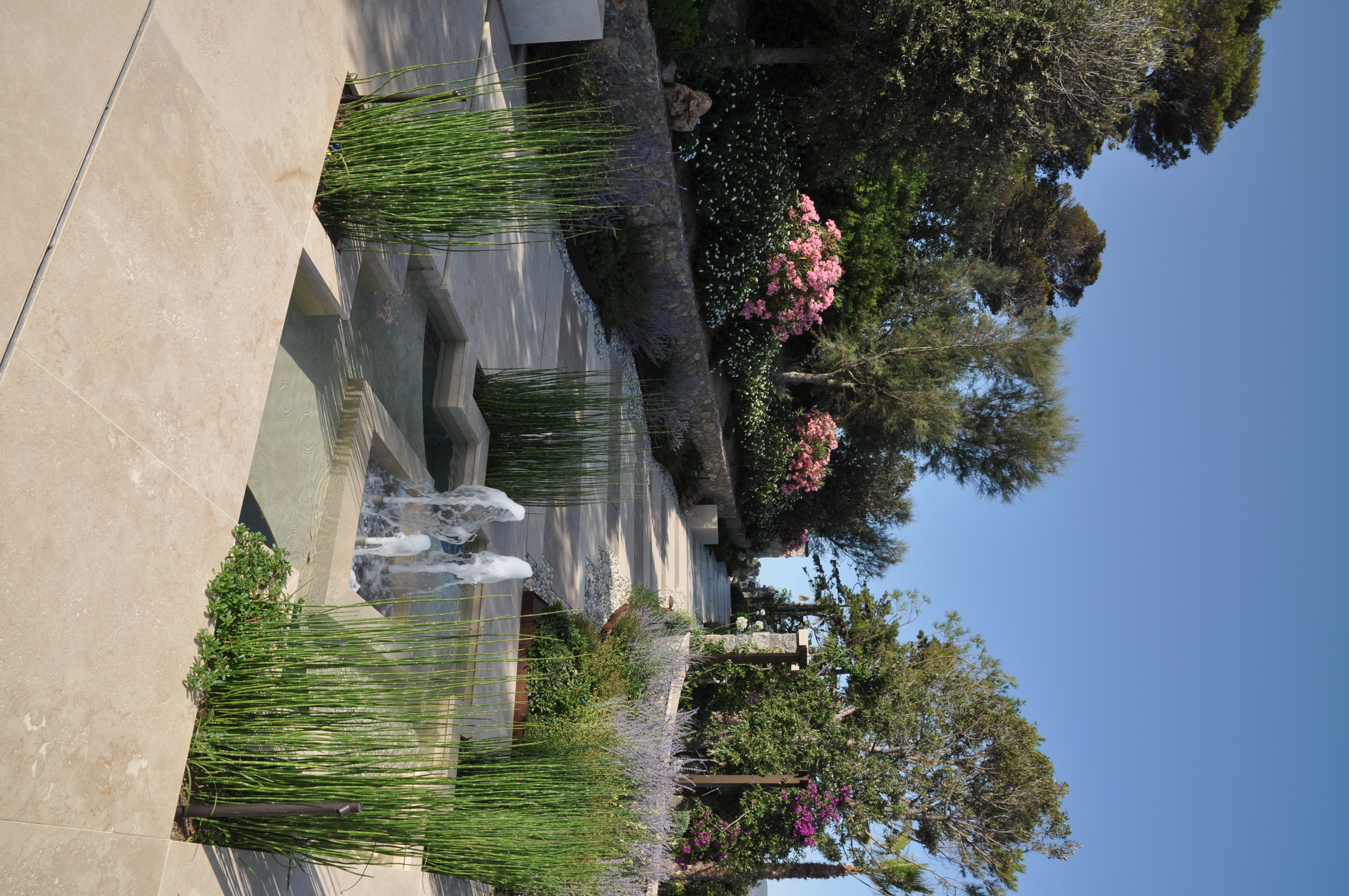 La costa tirrenica della Toscana è caratterizzata, nella zona dell’Argentario, da alte scogliere. La proprietà si presenta con una villa e altri quattro edifici aggrappati come albatri su di uno scoglio a picco sul mare. Questo scoglio è diventato un giardino, un giardino completamente inserito nell’ambiente circostante, un giardino su cui sono state incastonate preziose architetture e dentro al quale si aprono sorprendenti stanze verdi con finestre che si affacciano su splendidi panorami.